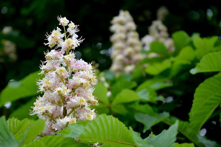 У каштана узнаваемые, очень характерные крупные резные листья. Дерево особенно эффектно в период цветения. Цветы каштана имеют форму пирамидальной свечи, которая состоит из 20-50 цветков.