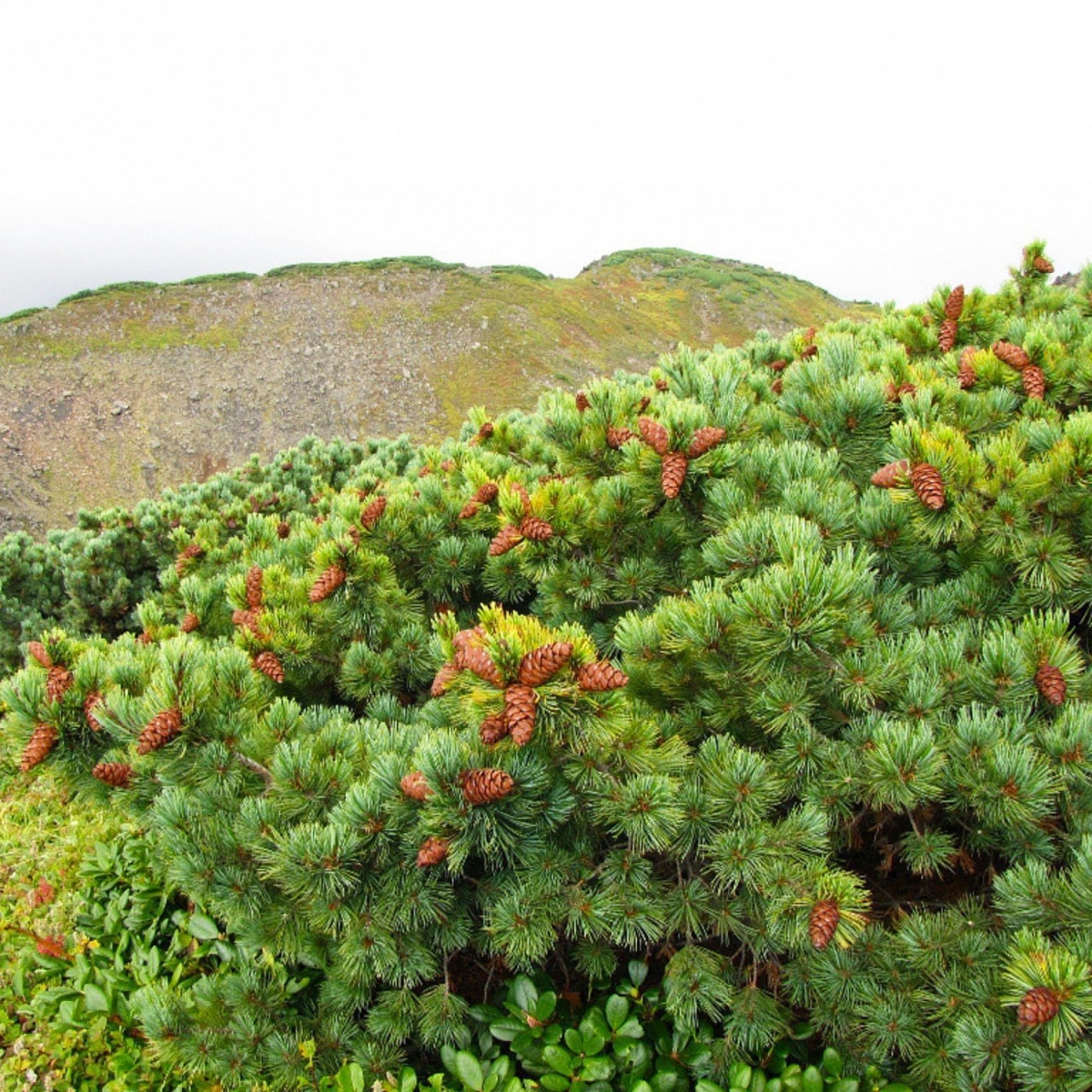 Карликовая сибирская сосна с пушистыми стелящимися по поверхности ветвями.